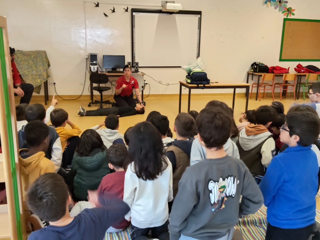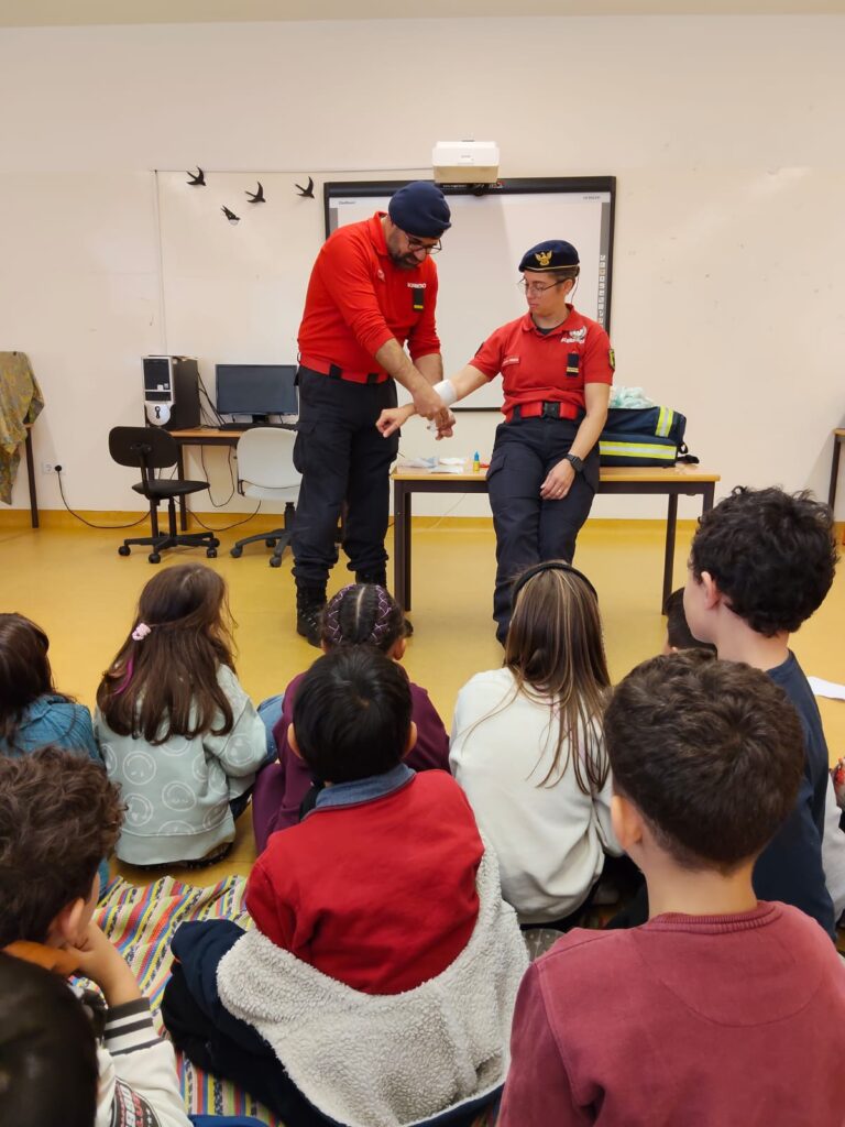 Nesta sessão, os bombeiros esclareceram como funciona o atendimento na linha de emergência (112) e recordaram o que são os primeiros socorros e o que devemos ter na mala que permite realizar essa primeira ajuda a uma vítima. Posteriormente, realizando pequenas demonstrações, explicaram os procedimentos que devemos adotar em situações de queimaduras, hematomas, hemorragias, picada de insetos, mordedura de animais, fraturas e distensões musculares.