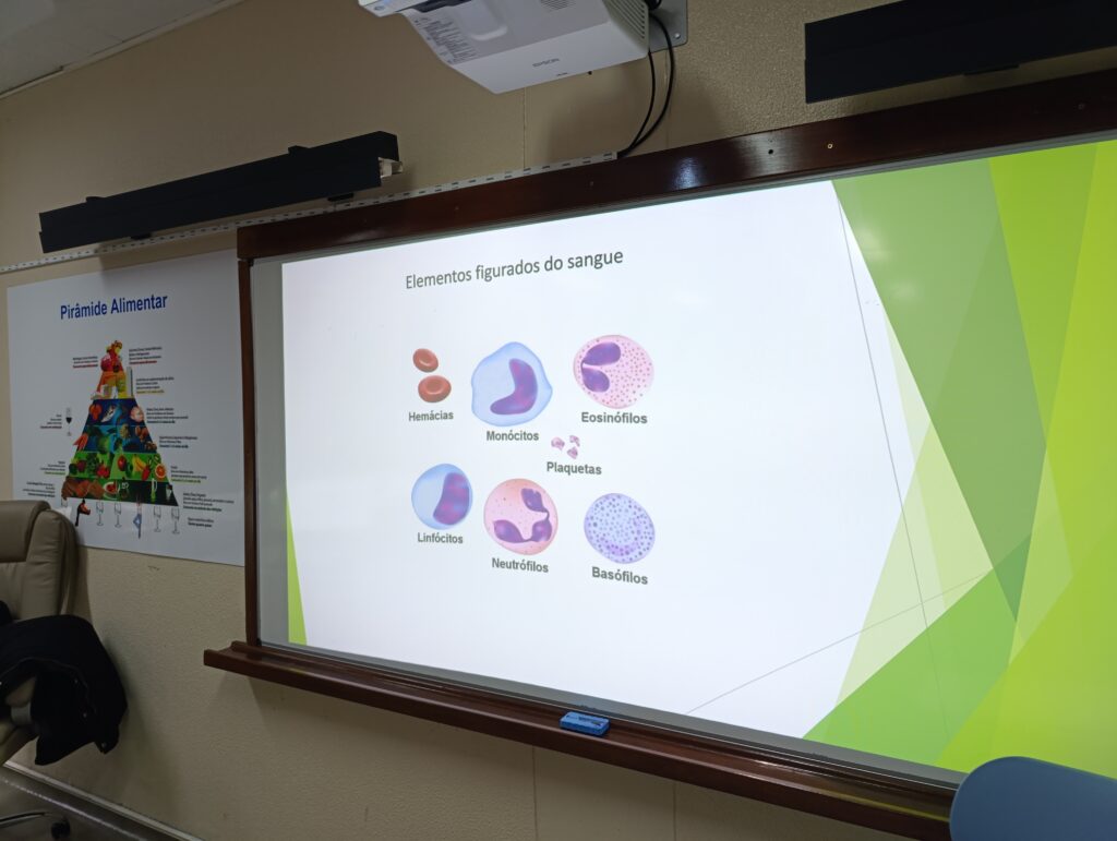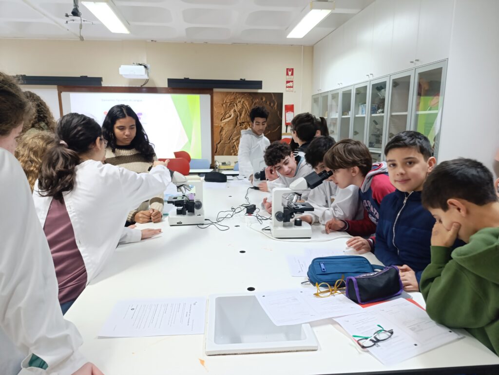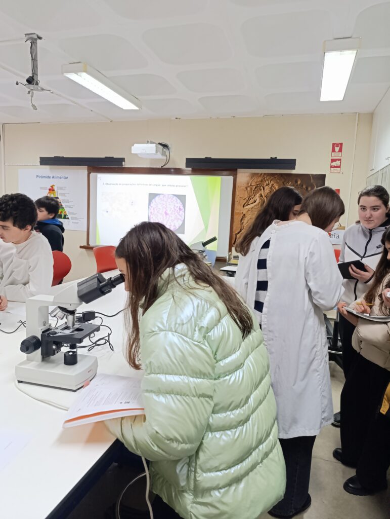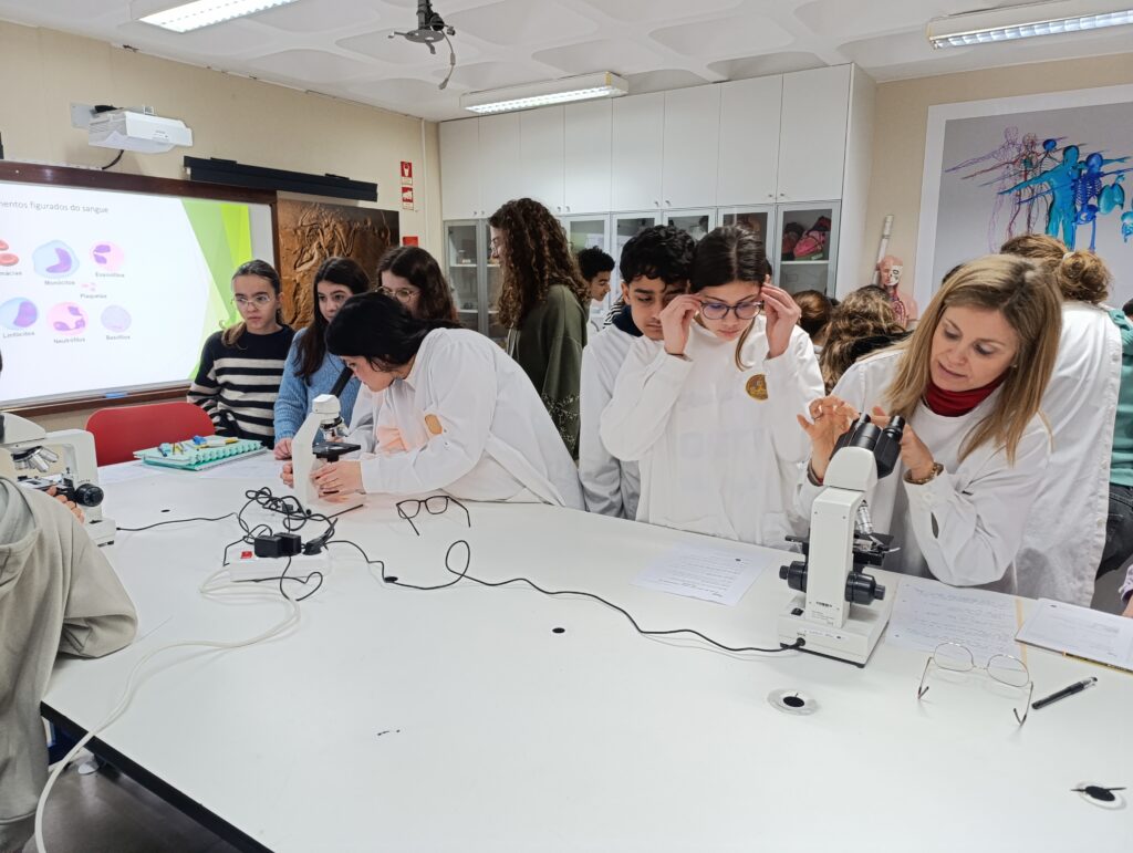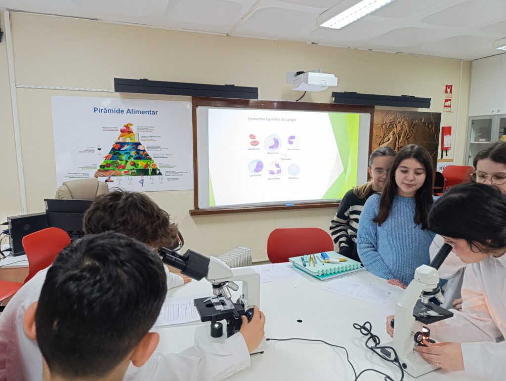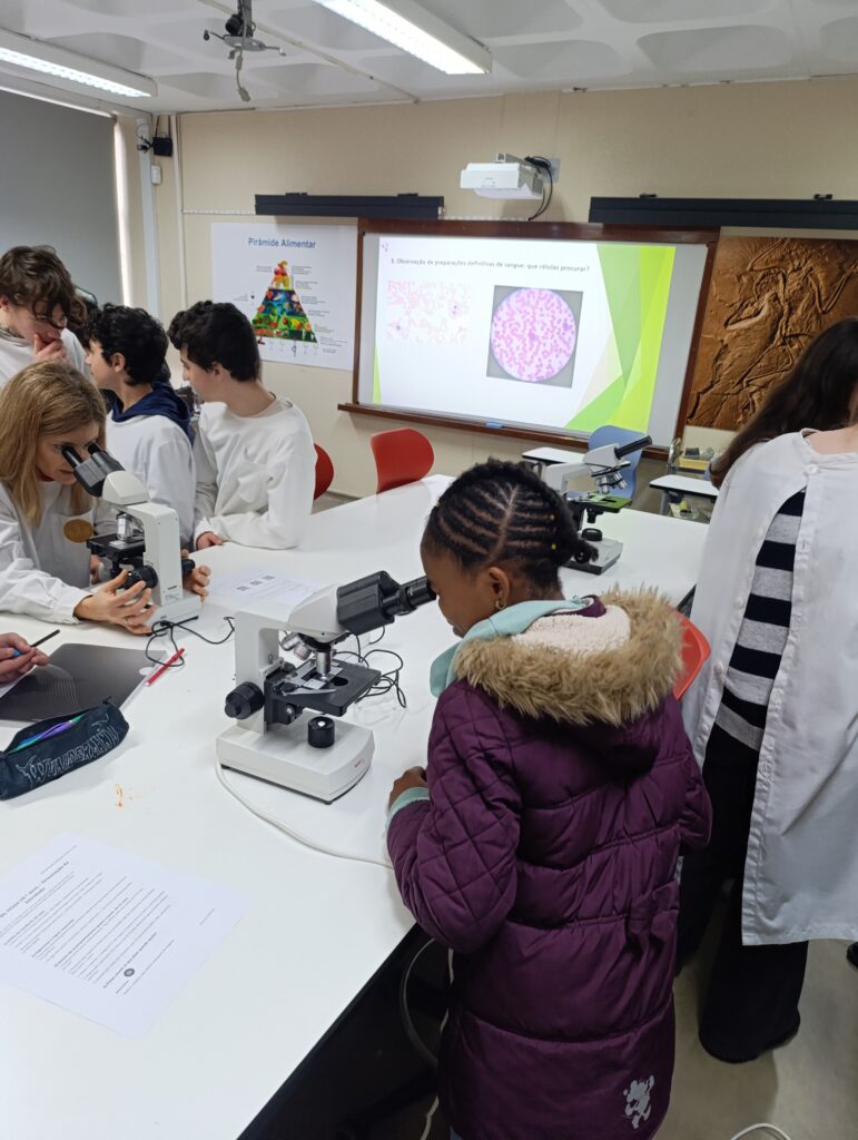 A atividade realizada no âmbito do Projeto “Aprendo Melhor Contigo” destacou-se pela colaboração entre os alunos da turma C do 8.º ano, que assumiram o papel de tutores, e as turmas A e I do 6.º ano de escolaridade. Os alunos de 8ºano , sob orientação das professoras de Ciências Naturais do 2º e 3º ciclos, orientaram os colegas mais novos na identificação de células sanguíneas humanas apoiando-os na observação das lâminas e na compreensão das funções de cada componente do sangue.