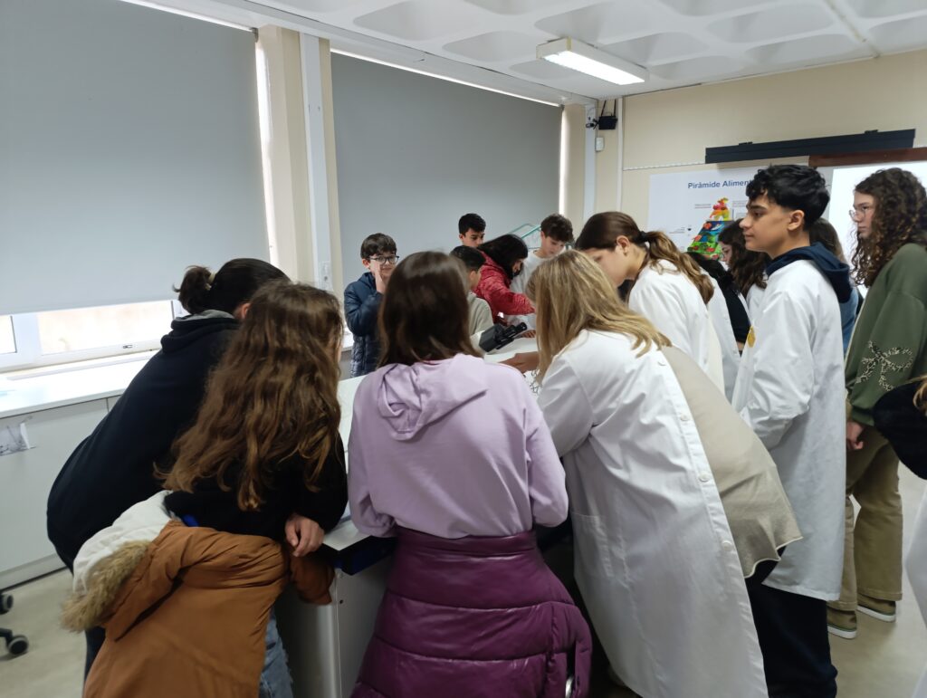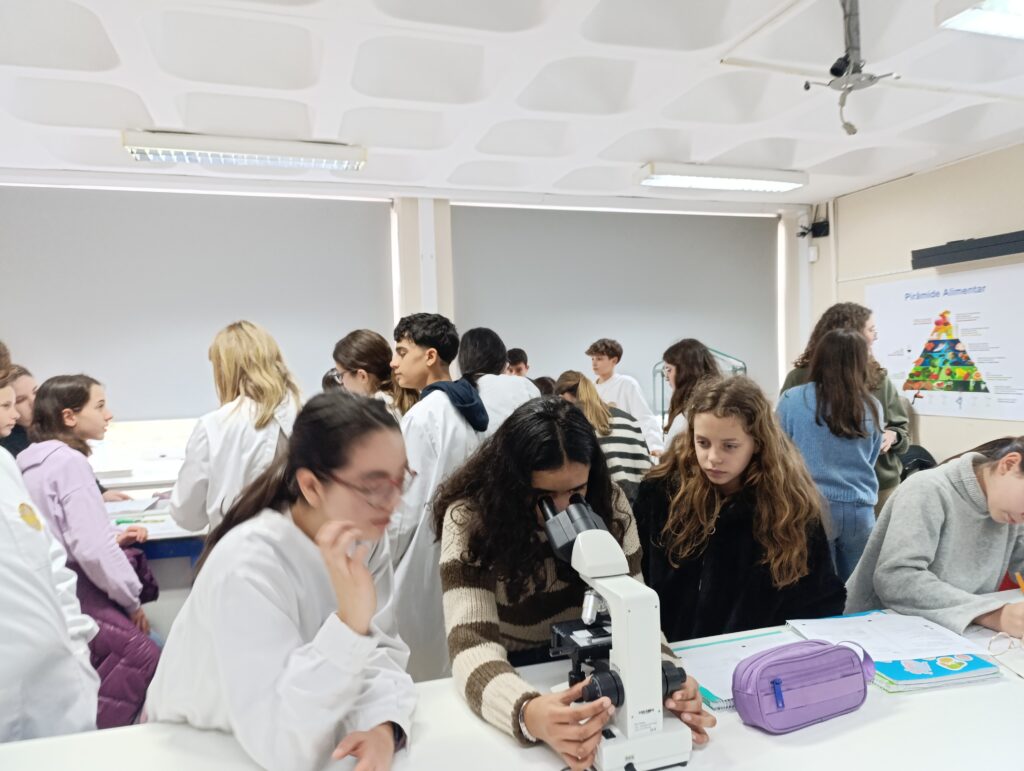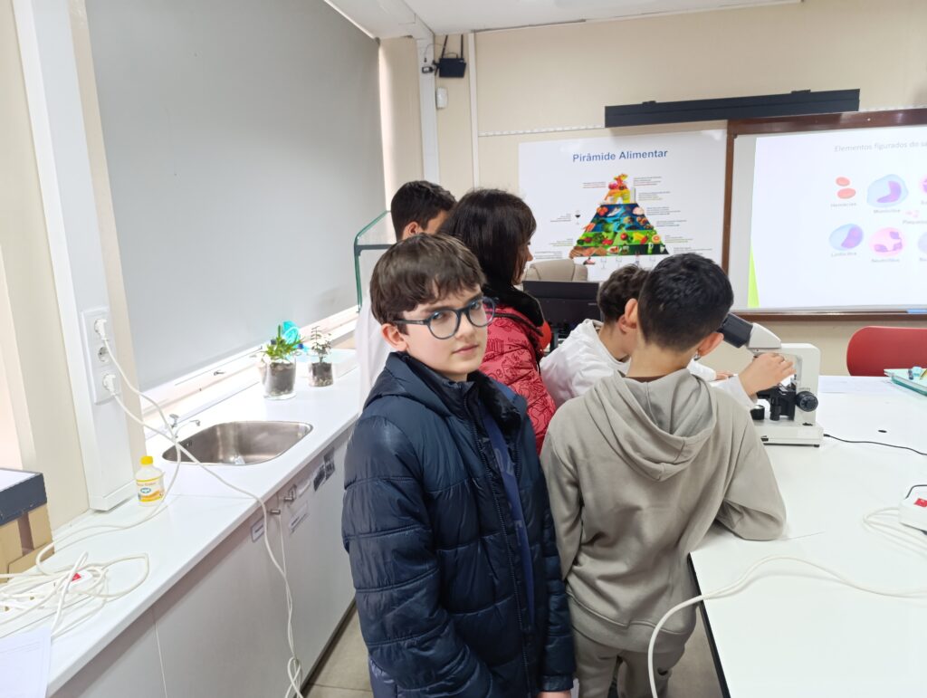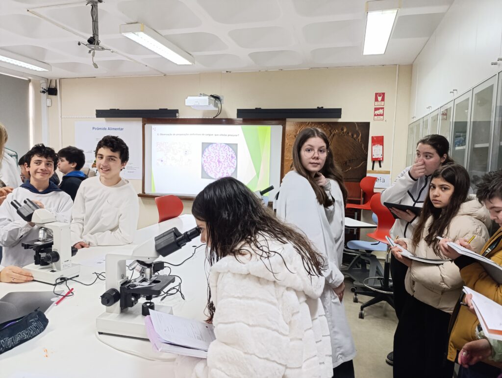 Além disso, os alunos do 8.º ano desempenharam um papel fundamental no ensino do uso correto do microscópio ótico composto, ajudando os mais novos a ajustar o equipamento, focar as imagens e desenvolver autonomia na prática laboratorial.