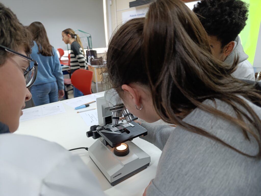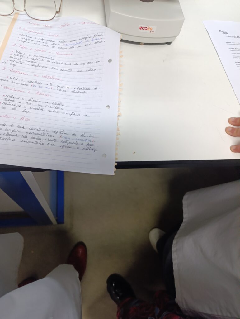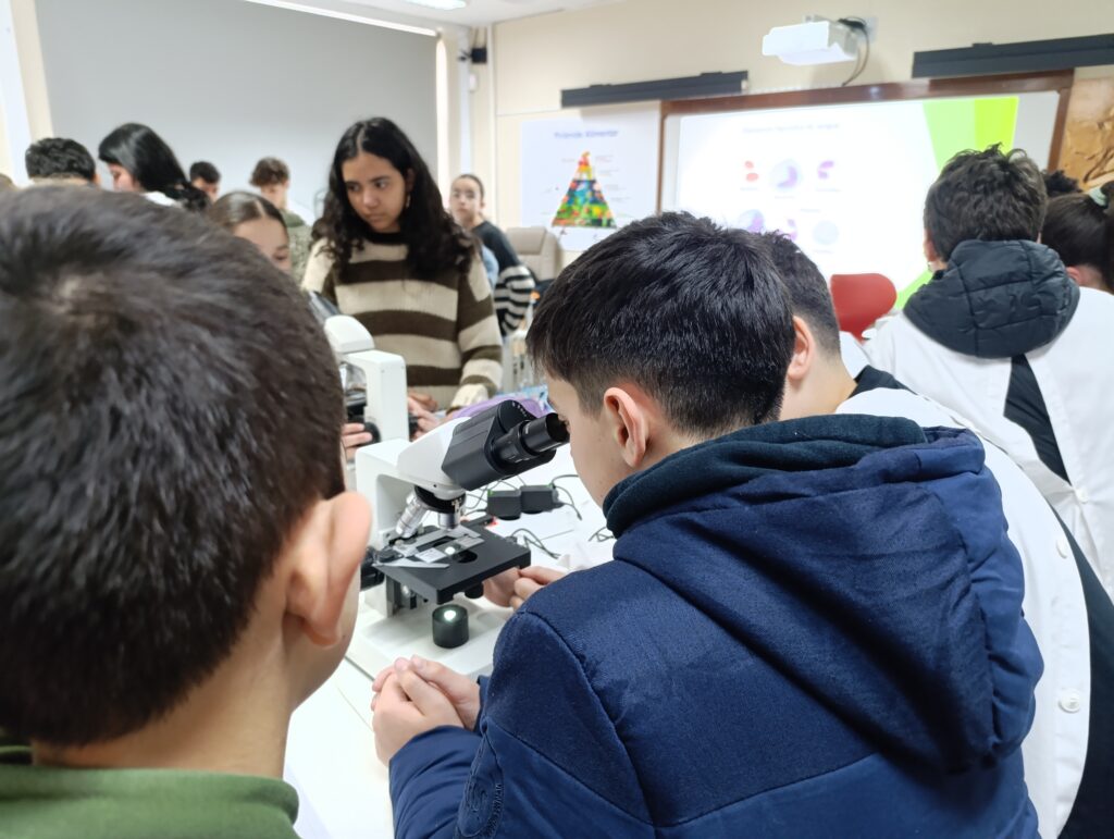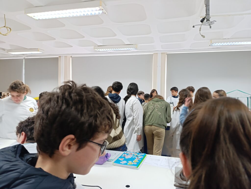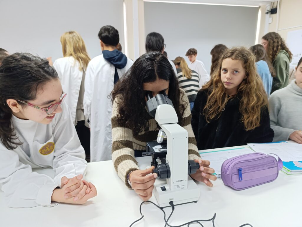 Além disso, os alunos do 8.º ano desempenharam um papel fundamental no ensino do uso correto do microscópio ótico composto, ajudando os mais novos a ajustar o equipamento, focar as imagens e desenvolver autonomia na prática laboratorial.