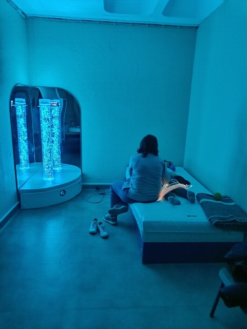 Sala Snoezelen Desfrutando de experiências sensoriais positivas e de momentos de relaxamento, na nossa sala multissensorial, com a cooperação da Terapeuta…